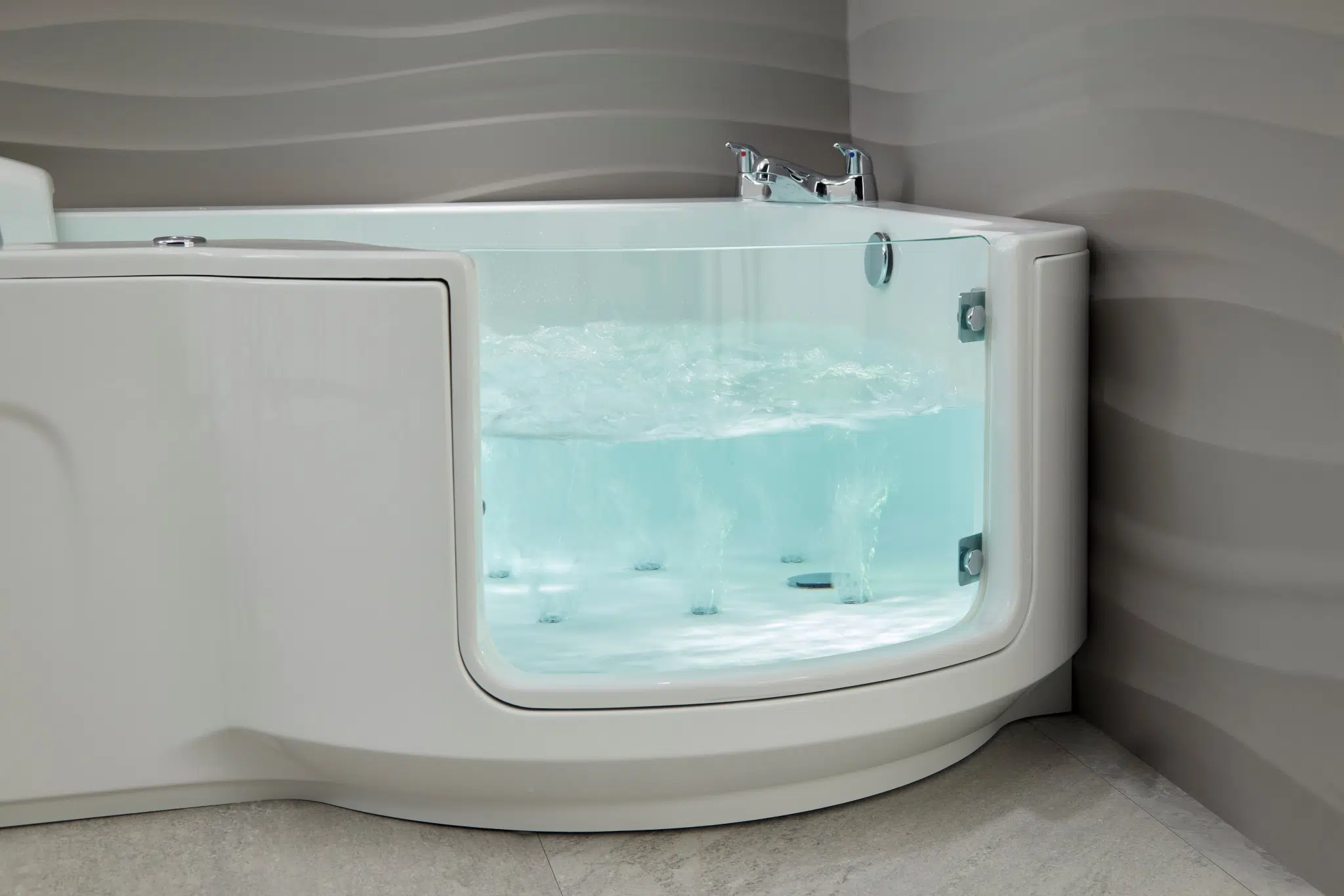 Every Access bath has an easy open door with low level access close to floor level. This means the difficulty of stepping into a bath is no more! You simply open the door, step onto a slip-resistant surface and sit in a controlled and safe way on the integrated seat.